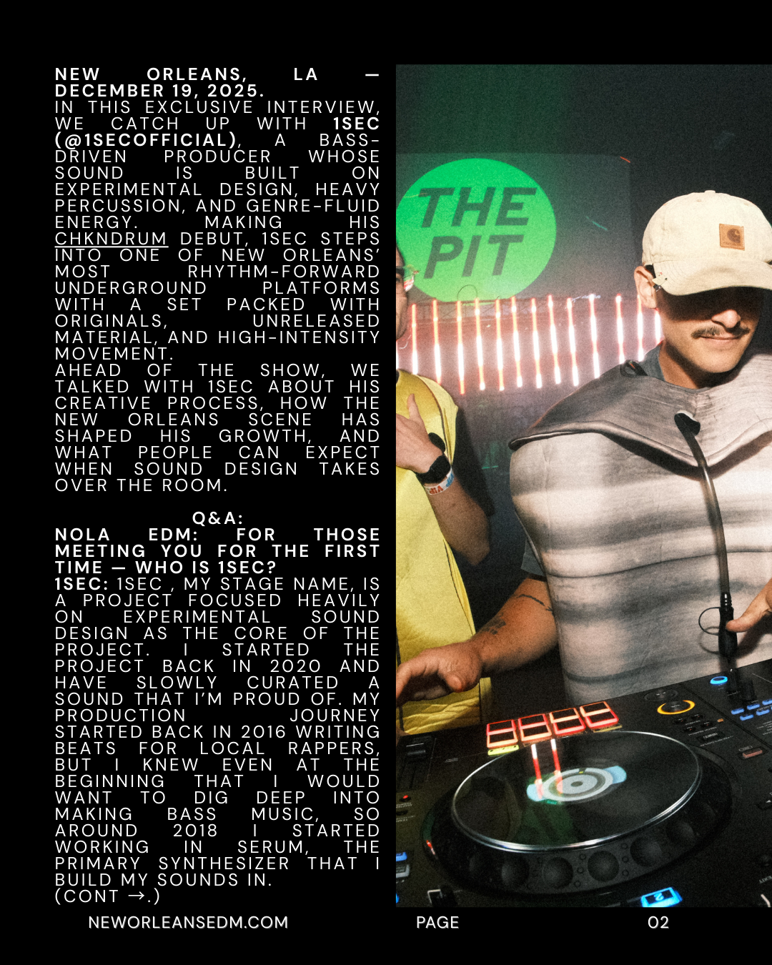 Ahead of the show, we talked with 1SEC about his creative process, how the New Orleans scene has shaped his growth, and what people can expect when sound design takes over the room.