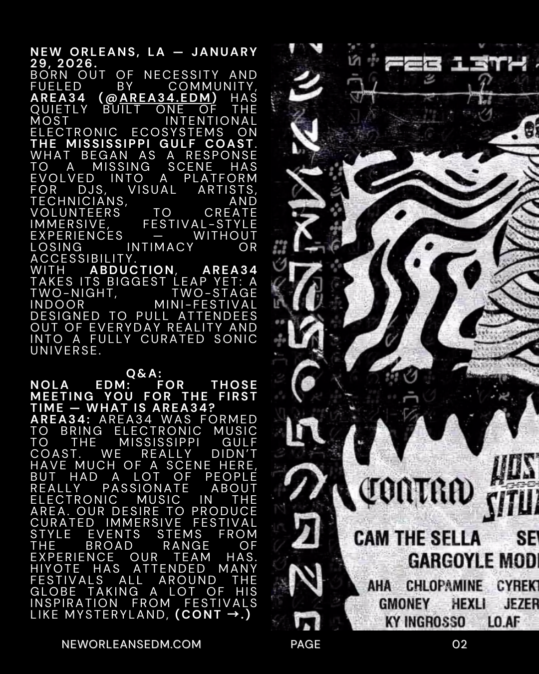 ⚜️ AREA34’s Abduction Mini-Festival lands as a two-night indoor takeover built around immersive sound, narrative-driven programming, and Gulf Coast community power. From experimental bass and alien themes to high-energy chaos and Valentine’s Day house, Abduction marks a bold next chapter for the Mississippi electronic underground. ⚜️