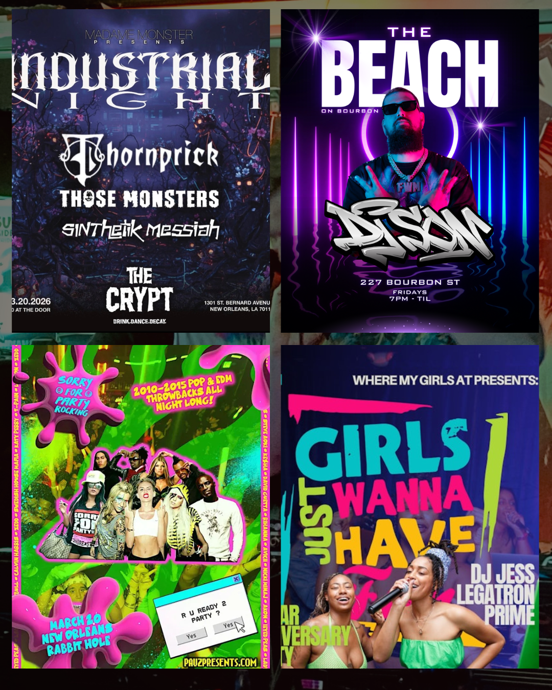Six years of celebrating women in New Orleans nightlife. Where My Girls At returns to No Dice for a Women’s History Month edition featuring Legatron Prime, DJ Jess, and the crew that’s been pushing femme-forward dance floors across the city.