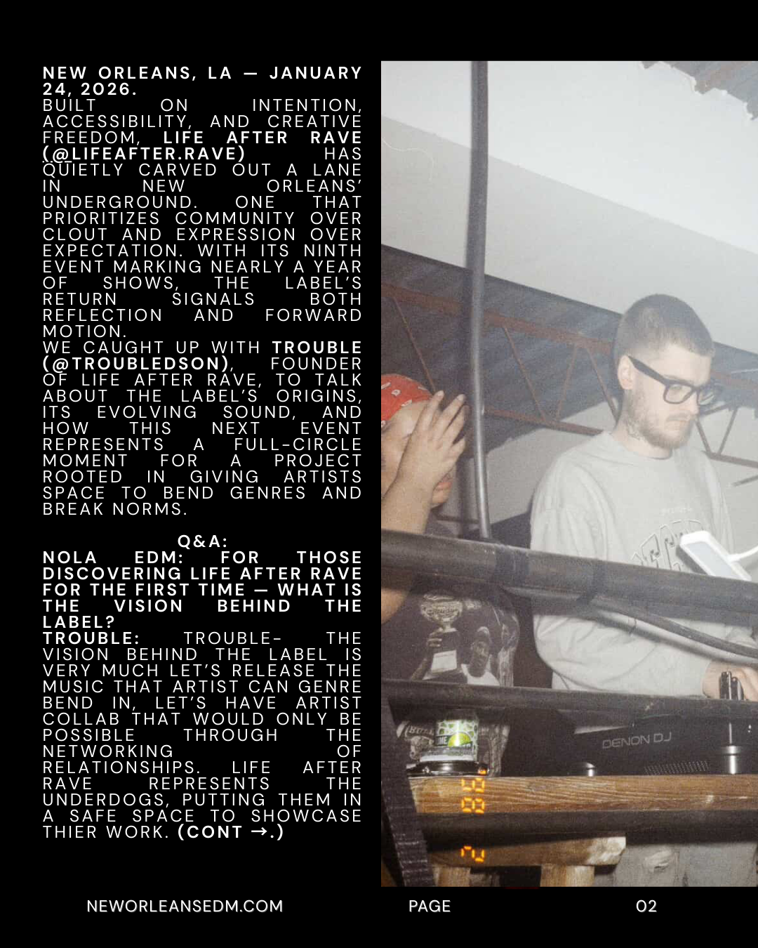 ⚜️ Life After Rave returns with a new lineup, a new venue, and a renewed focus on community-driven, genre-blurring underground culture. We caught up with founder TroubledSon to talk about the label’s vision, its upcoming showcase, and what it means to create space for the underdogs of New Orleans’ dance scene. ⚜️