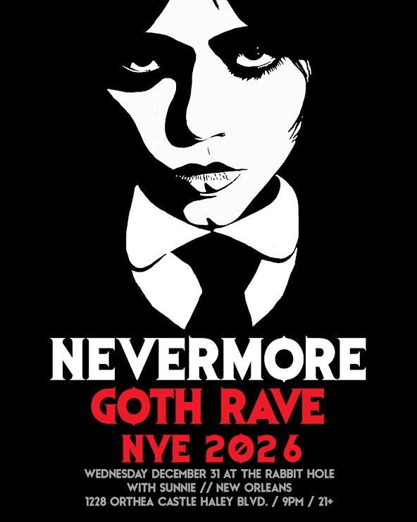 Step into Nevermore [Goth Rave], New Orleans’ most shadowy New Year’s Eve celebration. Hosted by The Rabbit Hole and GBH Events, this dark dance ritual unites the city’s underground for a night of sonic decadence and midnight transformation.