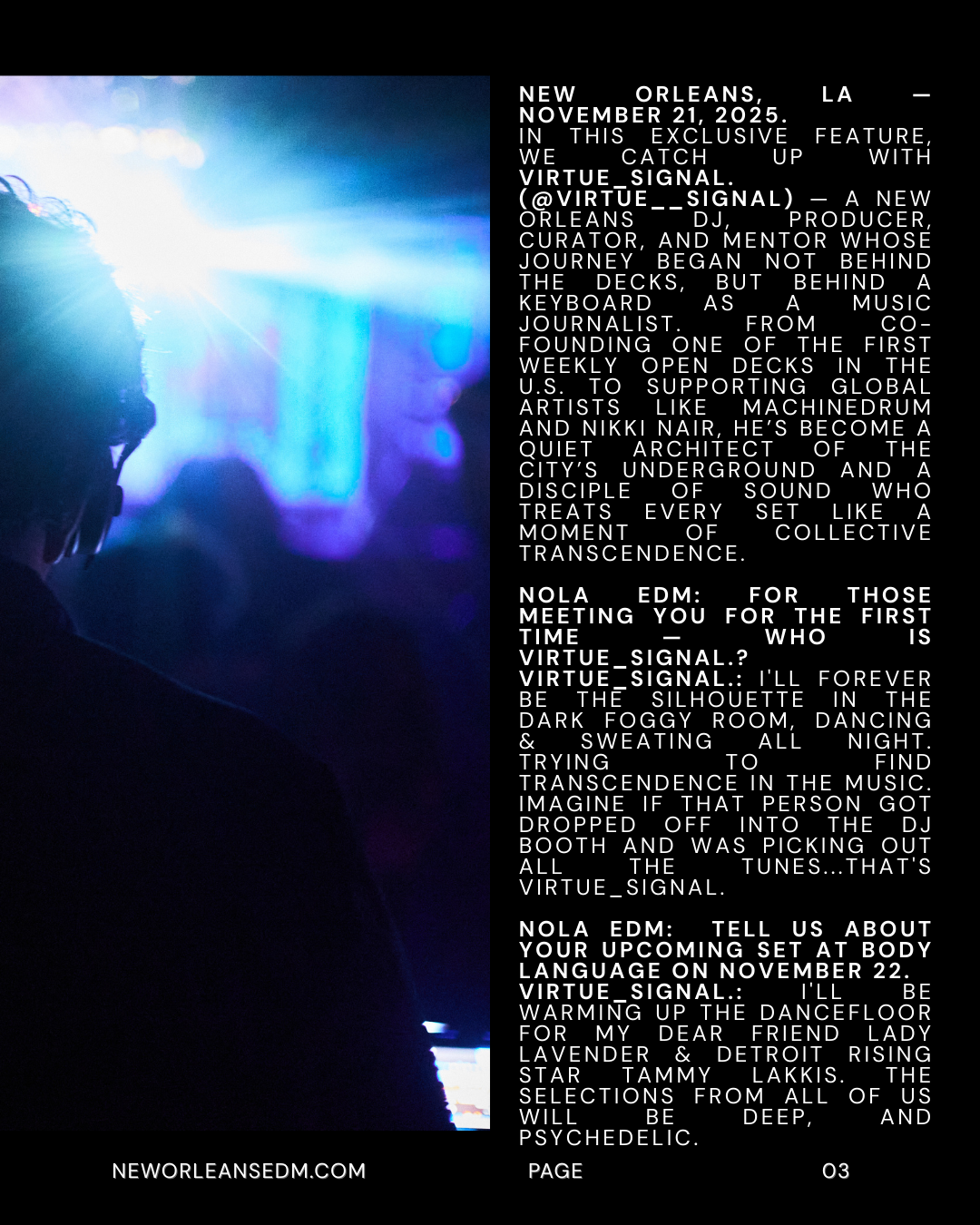 In this exclusive interview, we catch up with virtue_signal (@virtue__signal) — a New Orleans DJ, producer, curator, and mentor whose journey began not behind the decks, but behind a keyboard as a music journalist. From co-founding one of the first weekly open decks in the U.S. to supporting global artists like Machinedrum and Nikki Nair, he’s become a quiet architect of the city’s underground and a disciple of sound who treats every set like a moment of collective transcendence.